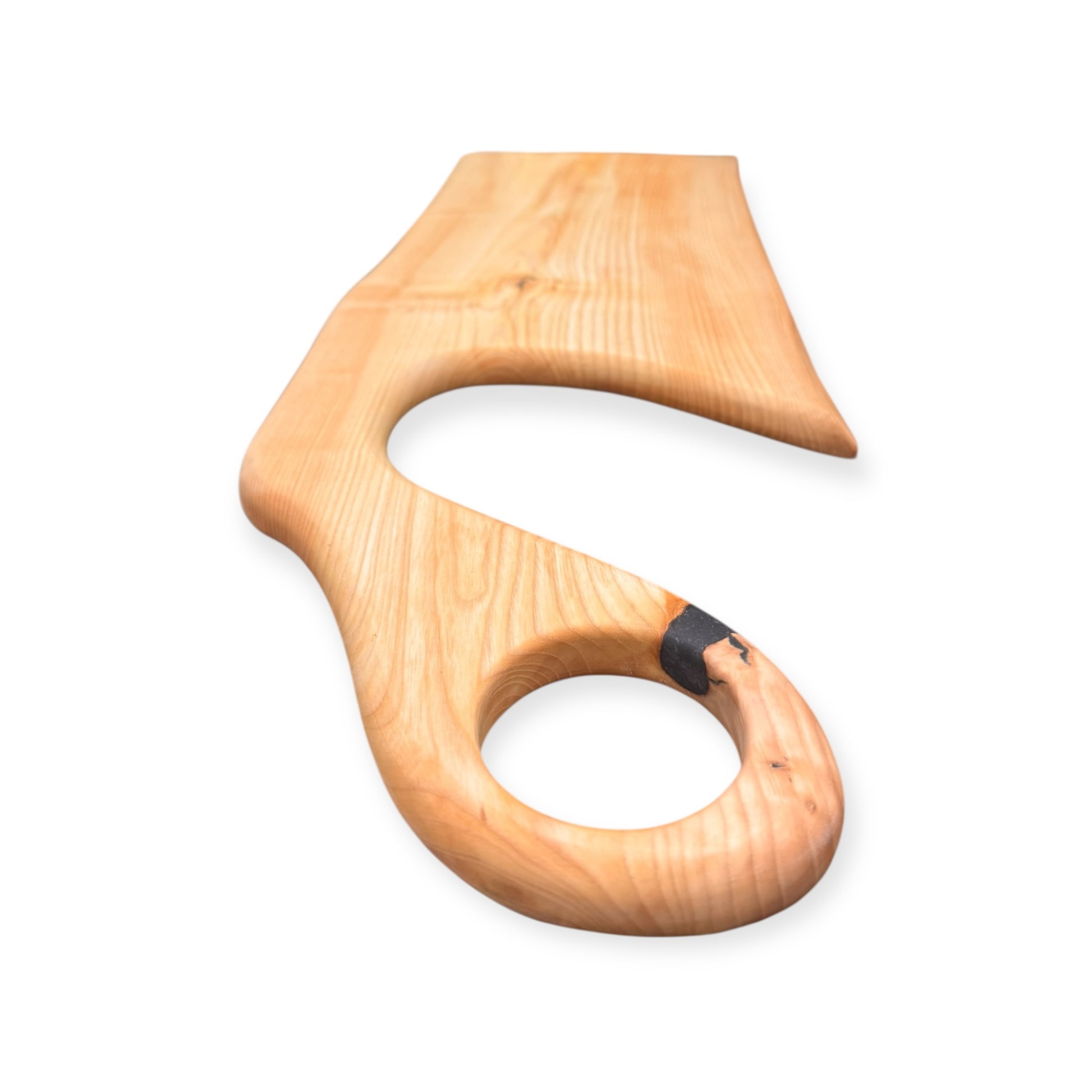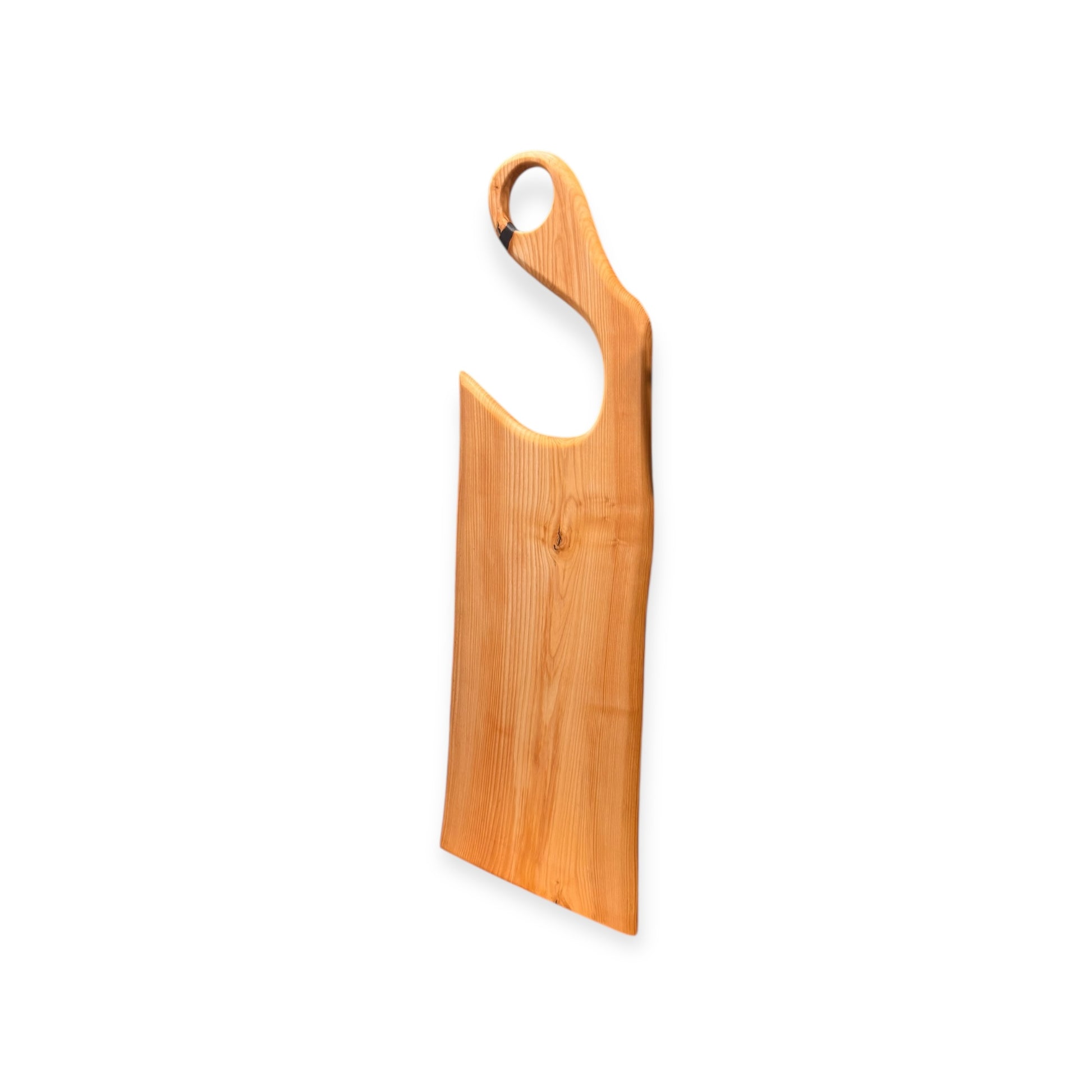 This 31” × 10” × 7/16” ash serving board has a tall, modern profile with a flowing sculpted handle that immediately stands out. A soft live edge runs down one side, giving it an organic shape while the smooth grain keeps the board clean and refined. The handle is carved with a wide, comfortable grip, and the board’s lightweight thickness makes it easy to pick up and serve with despite its length. Made from urban-salvaged Oregon ash and finished with 100% food-safe mineral oil, it’s a striking piece for charcuterie, bread, or decorative display.