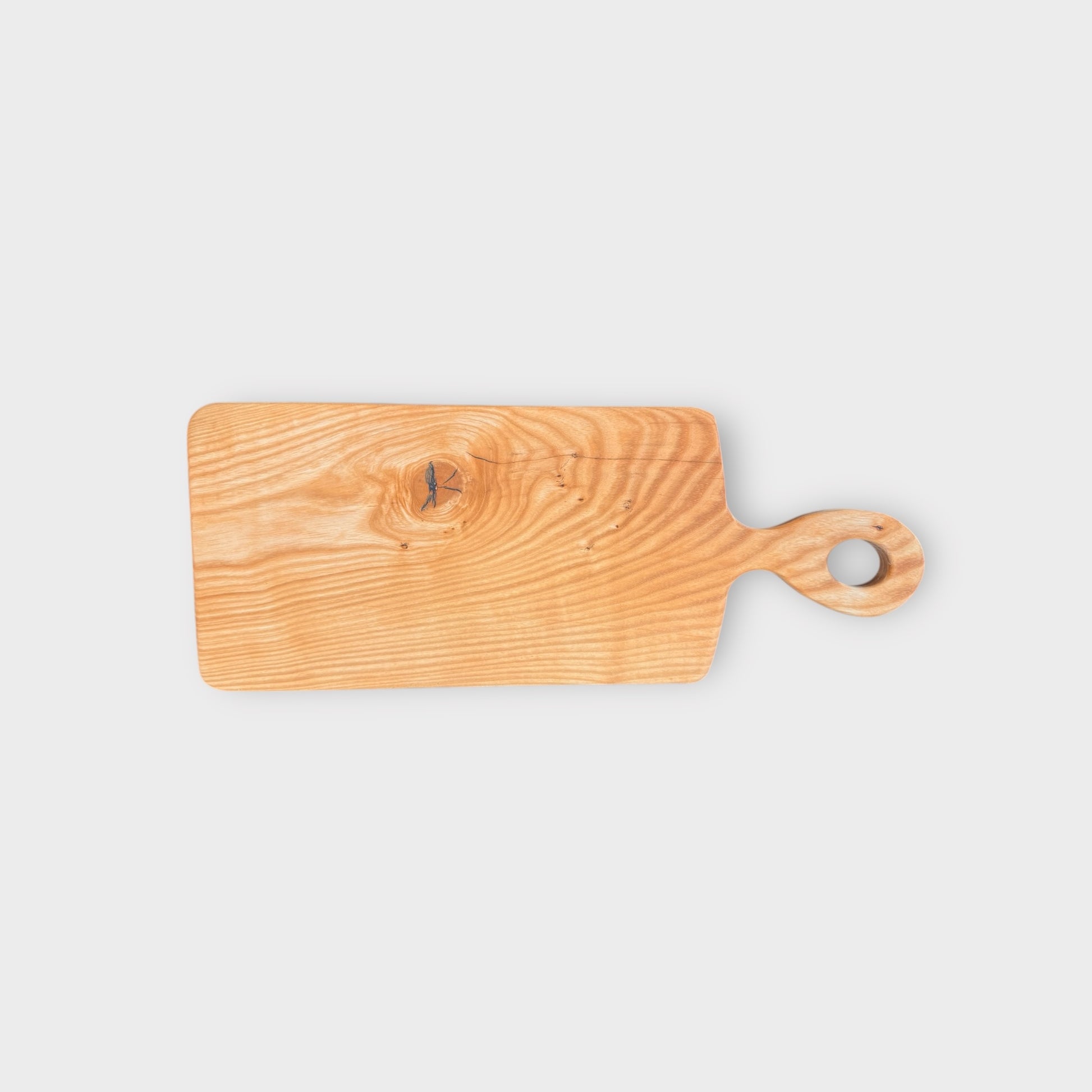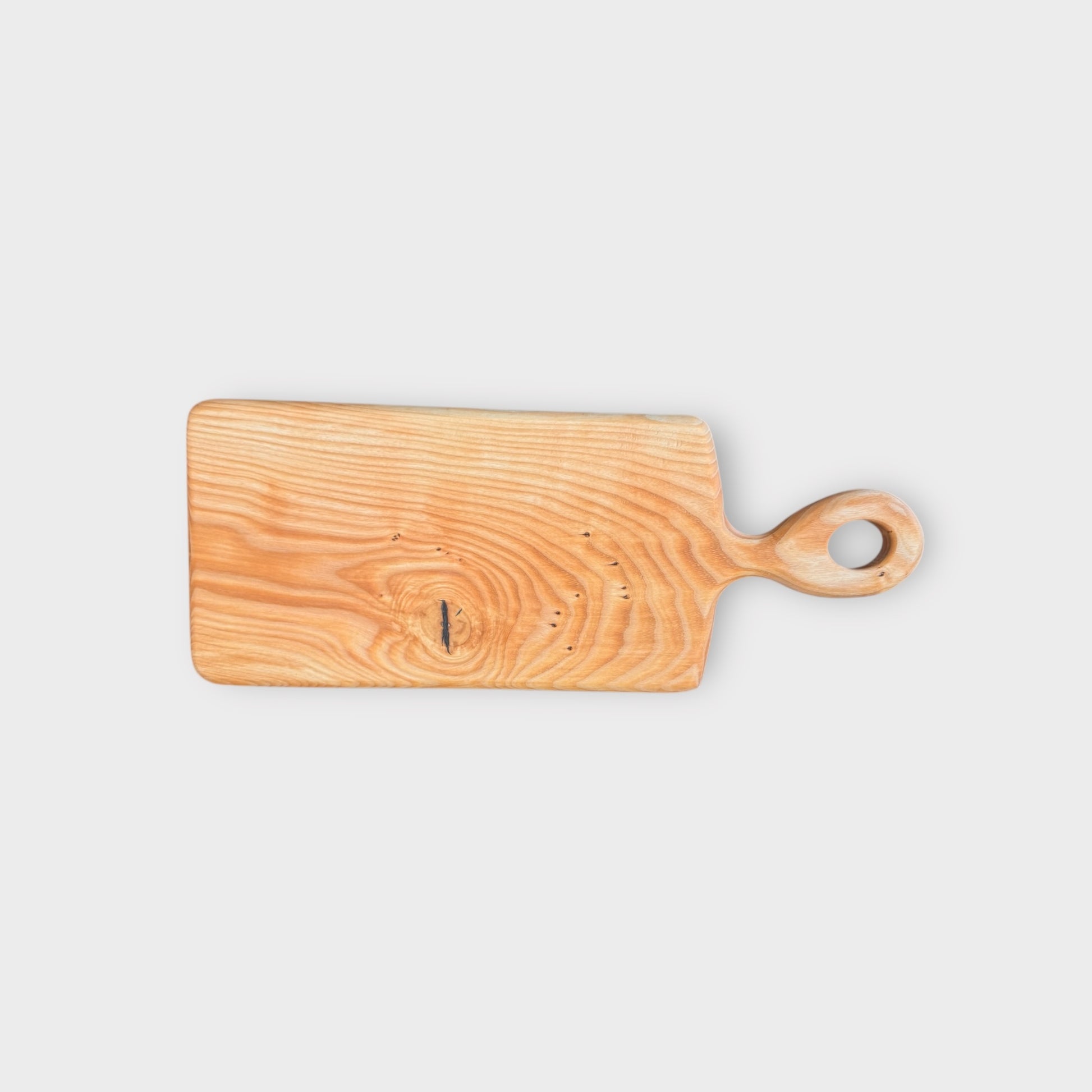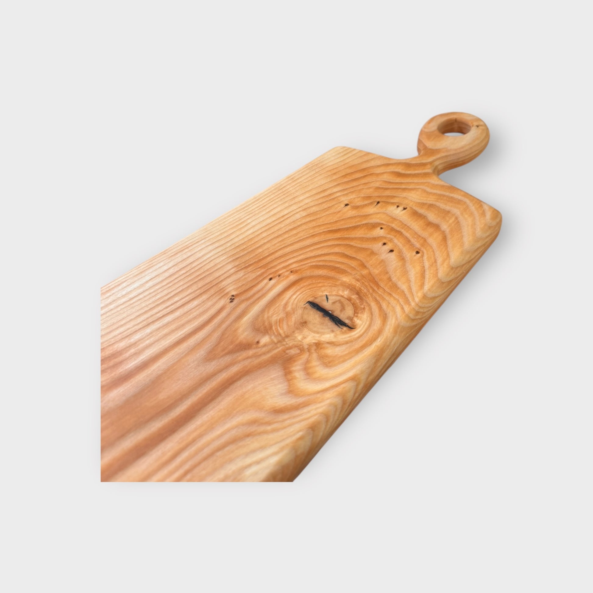 Measuring 19” x 7.625” x .75”, this Ash board blends a natural live edge with a simple, smooth surface. The black epoxy fills add contrast without taking away from the wood’s grain. Finished with food-safe mineral oil, it works well for serving, staging, or everyday use.